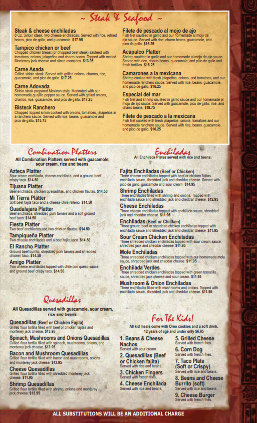 Fish filet & shrimp sautéed in garlic & our homemade al mojo de ajo sauce. Served with rice, charro beans, guacamole, pico de gallo & fresh tortillas